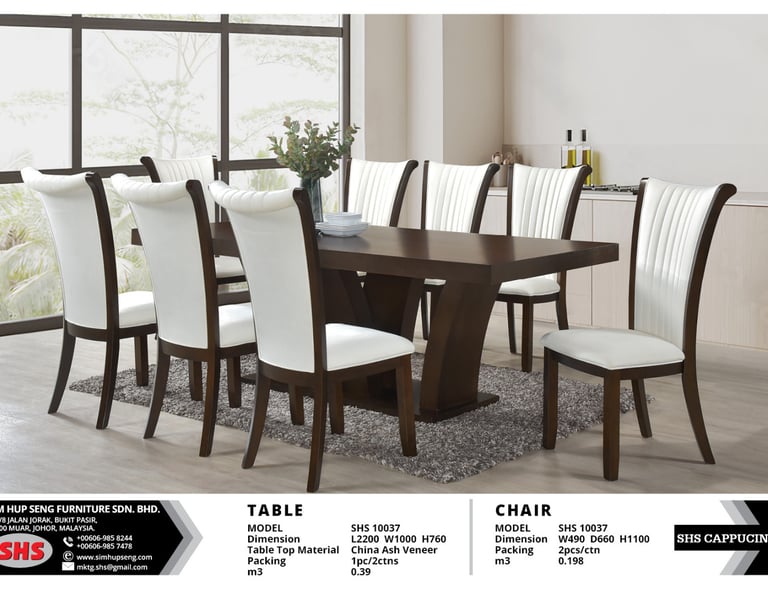 Material: China Ash Veneer Table Top Table: L2200 W1000 H750 mm Chair: W485 D630 H1000 mm