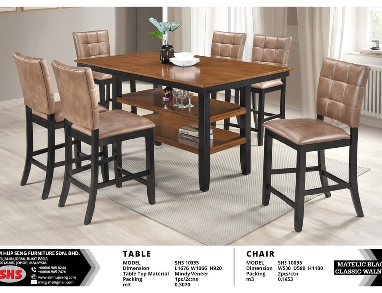 Maximize dining room utility with this counter-height set. The table features two built-in storage shelves, finished in Matelic Black and Classic Walnut. Paired with easy-to-clean PU leather chairs.